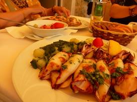 中午時刻,導遊幫我們介紹,老城外的一家餐廳,她說物美價廉。葡萄藤的庭院,很是涼快,先叫了啤酒。今天是妻的生日,我們叫了海鮮烤小卷、鮮蝦紅燒鮪魚。我們悠閒的享受午餐,祝福盡在不言中,導遊留給我們充裕的時間。我們同桌,來的杜塞道夫的德國朋友,也極為友善的聊天。我在德國住久了,極為習慣德國的Mentalität。飯後我們海邊散步,美麗的海灣,清澈的水文。德國的TUI客輪,也停在碼頭。海風微微的吹,無限感性的感覺。謝謝妻的照顧,謝謝妻的陪伴。