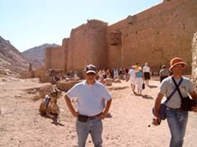 (324AD)時代,羅馬查士丁尼時代(537AD)又續建,是為紀念亞力山大城的女基督徒而重建的,她反對偶像崇拜而被害,屍體後來又完整的被發現.當時查士丁尼時代,基督宗教已取得信仰的主導權,凱薩琳修道院的政治化分屬於東羅馬,當然屬於東方正教.當今凱薩琳修道院的住持是清一色的俄國人,所以這裡的俄國朝聖者特別多.離開凱薩琳修道院,我們就要回到紅海的渡假區Sharm