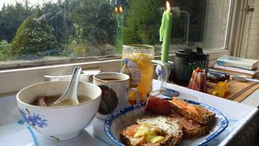 早餐:孤戀花、蠟燭、冬歸湯、鮭魚、 Cabadossi。 |