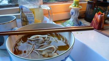 今天溫度零下13度,好凍的天氣。卻出太陽,暖和的陽光,像母親的溫暖。今天是週末,聽孤戀花,風微微風微微,孤單悶悶在池邊,水蓮花滿滿是,靜靜等待露水滴。韓瑜白玉蘭坐在三輪車上,一晃一晃,很是古早台灣味,勾起我小時候的回憶。我還是從心底,喜歡鄉下的純樸,不愛城市的虛偽矯情。我吃著豐富的早餐:麵包夾薰鮭魚、 意大利Cabadossi、匈牙利薩拉米、Avocado、冬歸牛肉湯。讀報紙看小說,喝咖啡吃蛋糕。天氣很冷,乾脆煮麻油雞,來暖和身體。放少許幼麵,多加些米酒,很夠力勁,茫茫的享受。繼續看村上春樹的1Q84,我蠻喜歡村上春樹的小說,總有些哲學觀點與結構。他談到榮格的集體潛意識,我本來就喜歡。也談到榮格在瑞士湖邊,自己建的石板小屋,在牆上自己刻著:無論冷或不冷,神都在這裡。Bravo!真夠味!很是共鳴!我也在想,在院子作一點什麼,滿足自己,把潛意識說出來。又想創作出來,就不是我的想法了,遲遲沒有動作。於是只能:簡單平凡就好了。我沒有野心,也沒有使命,快樂平安就好了。