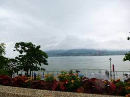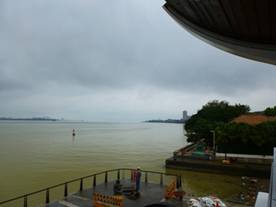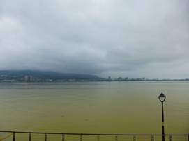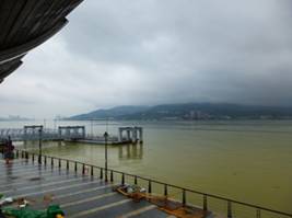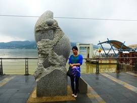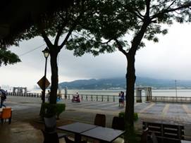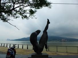 2014-05-22.跟Lina約好,今天去淡水玩,昨夜梅雨,今早陽光。我們來到淡水,天下著毛毛雨,沒掃我們的遊興。小雨點飄落河面,雲罩著山巒,更增淡水嫵媚,觀音山朦朧如仙境。我們沿著提岸人行道,商家烤魷魚、鮮榨果汁。我想起金門王與李炳南,流浪到淡水。我們看到岸邊一座雕刻,名曰淡水迎曦,人體彎曲,一腳迎空,煞是美感創意。走了五十公尺,另一雕刻,有點抽象意味,不知名道,卻是幻想。我們走到河提盡頭,找家相思樹下餐廳坐坐,吃點蝦卷黑連簡餐,看看河面遠山,飄然幽靜,淡水河確實美麗,我想為它取可名字:藝術家之路?哲學家之路?