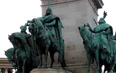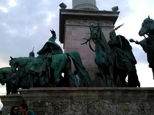 我們來到布達佩斯英雄廣場,已是黃昏時刻,視線有點昏暗。廣場正中央,一座聳天圓柱,從地拔起,上面是Gabriel天使的雕像,傳遞神的信息。底下是七座騎馬英雄雕像,他們便是以Arpad公爵為首的七部落首領。他們從中亞跋涉而來,游牧民族逐水草而居,歷經無數戰役,包括東羅馬帝國,拜占庭的戰役。最後在多瑙河畔,今日布達佩斯的地方停了下來,建立家園。1896年匈牙利人為紀念,他們的祖先一千年前,在這裡篳路藍縷,而興建布達佩斯英雄廣場,千年紀念碑,Millenniumsdenkmal。我看著七位部落首領,各各趾高氣揚,有點青面獠牙,但不失英雄本色。除了七位部落首領,兩邊是白色的半圓形圓柱圍成。上面一共有13座雕像,是匈牙利歷代的英雄國王,當然也包括第一位王朝國王,聖斯蒂芬一世Stephan I.