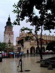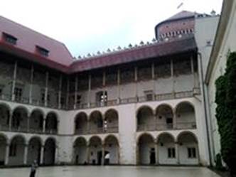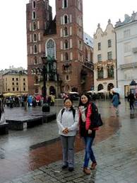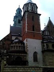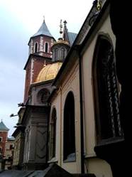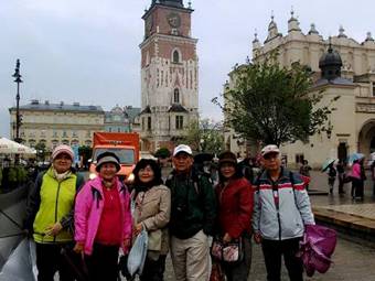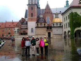 我們來到Krakau,它是波蘭古老城市,古城哥德式、文藝復興、巴洛克建築,雜陳並立。它是聯合國文物保護城市,2000年歐洲文化城市。Wisła河流經這裡,我們車子停在Wisła山丘下,慢慢散步而上,山坡上一些歷史古蹟,廣闊的平台,便是Wisła宮殿,與Krakau主教座堂。教宗若望保祿二世,曾是Krakau的大主教。主教座堂,白邊紅色塔樓,像似佛羅倫斯的鐘塔,與百花聖母教堂,它的圓頂卻是金色的。天還是毛毛雨,我們先拍個團體照吧!映射的石板,綠色的草原,廢墟般的城牆,古老的甬道。我們慢慢走向平台岸邊,底下便是悠悠Wisła河水。居高臨下的風水,這裡兩萬年前,便有部落居住,販鹽為生。鹽是古代居民,重要的財富,也使Krakau成為富裕城市。