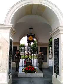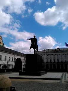 薩克森公園的邊陲,有個巴洛克噴泉,它的直對面,便是華沙英雄紀念碑。永垂不朽燃火,波蘭士兵站崗,國家主權的象徵。我們好奇帥哥士兵,頻頻照相,可能習慣了,帥哥不為所動。英雄紀念碑前面,一個大廣場,它叫Piłsudski廣場。有點類似,毛澤東紀念館的天安門廣場,好遼闊的廣場。廣場上好大的一個白色十字架,Piłsudski 雕像,聳立在廣場入口。Józef Piłsudski是第一次世界大戰時,波蘭的領袖,他聯合德國、奧地利,反抗俄國。雖然波蘭也曾被德、奧瓜分過。權宜之計,聯合次要敵人,打敗主要敵人。