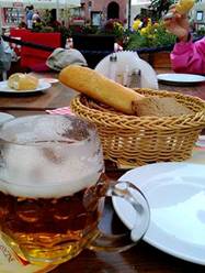 我們來到市集廣場,這裡好熱鬧,四周圍建築,顏色多彩姿。十四世紀的廣場,風格哥德式、文藝時代建築。主教座堂,鐘樓、廊道、拱門,把廣場裝飾得古典美麗。導遊介紹我們,那裡可買到真實的琥玻,到處禮品商店。我們只關心餐廳與咖啡館,在一家露天餐廳坐了下來,先來一大杯啤酒。風微微吹,好涼快,我們點了新鮮的沙拉與肉類。它的價錢很是平實,算是歐元區便宜的城市。分量也大盤,吃的舒服,服務員也友善。