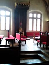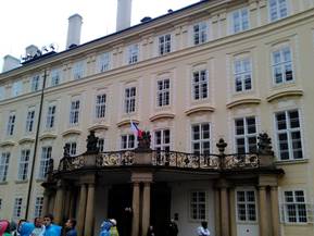 在大廳的右邊有一個門,從這個門便可直接轉入所謂的波希米亞首相府。在前廳是秘書們的工作室,室內有路易國王( 1516-1526)的王徽及城堡的模型。再進入內廳,便是首相辦公的地方了。這個首相府為路易國王所建,又位於正殿之側,所以這個首相府又稱為路易側殿。在這裏曾經發生過布拉格第二次墮窗事件,它引發了新舊教的三十年宗教戰爭,我們把三十年宗教戰爭的歷史放在後面來說。