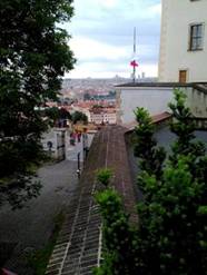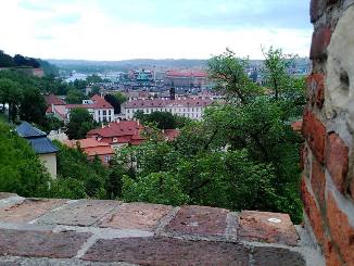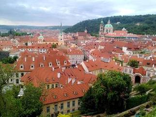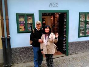 我們走出塔樓、黃金小巷。走向城堡外牆,站在碉堡上。莫道河水,遠處反光,翠綠的山林,紅色的屋頂,金色樓閣。山風吹來,美麗的布拉格老城。歷史在這裡發生多少故事,英雄人物都已流去。留下城堡的美麗,大自然的演化。我們與親戚慢慢走回,城堡入口,等著導遊集合,我們去午餐。