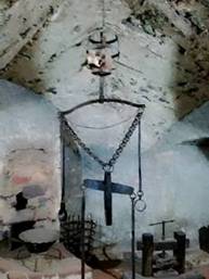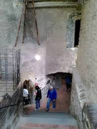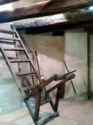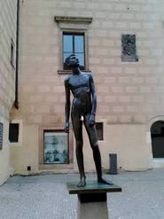 再往黃金小巷的斜坡走,這裡有個塔樓,它是監關城堡犯人的監獄。它叫Dalibor塔樓。歷史上十五世紀,有個波西米亞騎士Dalibor von Kozojedy,曾在這裡受刑,因而取名。我們走上塔樓,懸嘊般的墜落。走下地窖,無言的恐怖。我看過多次集中營,卻是第一次看到監獄牢房,是中世紀的牢房。完整的刑求設備,觸目驚心。塔樓外邊,還有犯人,苦楚的石雕。類似十八層地獄,閻羅王的雕像。我在想,被關在這裡的囚犯,都真罪有應得嗎?當然不是,人類歷史,許多政治冤獄。過了多年,加害者逍遙無事。人世間本是悲劇,那來公義。我想起蘇東波的詩:卻對酒杯疑是夢,試拈詩筆已如神。此災何必深追咎,竊祿從來豈有因。