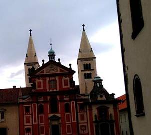 von Böhmen(1265- 1321)曾在這裡修道。中間雖曾斷續,參與政事,但晚年又回到修道院。於是這本篤會女修道院,就成了波西米亞重要象徵。基督受難,波西米亞宗教虔誠的象徵。這個修道院的名字,叫額我略修道院(英譯喬治)。我們走進美麗的大門,參觀的人群擁擠。人們在聖體龕櫃前,拱形的階梯走過,寧靜而虔誠。Kyrie Eleison上主憐憫我,額我略的音樂,似乎在我耳中嗚鳴響奏。我曾在梵蒂岡,伯多祿大教堂的彌撒裡,聽過Kyrie Eleison額我略的音符,是那麼震撼與感動。人是脆弱的,人生如佛家說的痛苦,人類就像希臘命運的悲劇,公義就是基督的十字架。