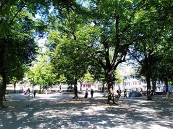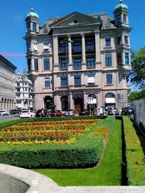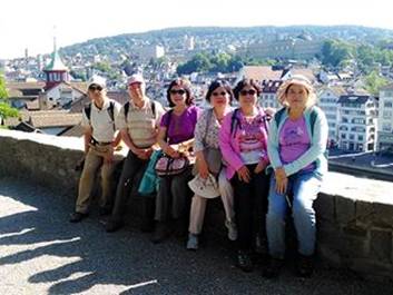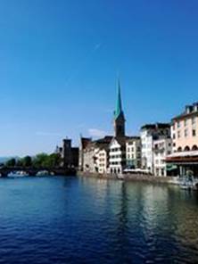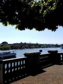 我們的車子停在利馬特Limmat河畔,涼快的綠蔭河畔。走進蘇黎士最熱鬧的街道,總火車站的精品大道。今天是週末,店面都關了門,員工需要休息,喜歡名牌的團員,有點失望。我們走向Rennweg斜坡,散步在丘陵上,階梯引向一個大莊園,這裡是蘇黎士菩提園Lindenhof。菩提園在利馬特河岸,丘陵居高臨下。河風搖曵菩提樹,人們這裡下棋,好是休閒。靠在觀景台,一座高聳的女英雄雕像,掌著旗幟,站在噴泉傍邊。它的典故來自十三世紀的傳說,蘇黎士的女英雄,使當時入侵的奧地利,Albrecht公爵軍隊,為之喪膽。今天她象徵著,蘇黎士的守護神。我們走向莊園圍牆,利馬特河彼岸是市政廳、老郵局。看著悠悠的利馬特河,這裡是古羅馬帝國時代,連接南歐與日耳曼的關卡,是中世紀的稅務關卡。蘇黎士演化為今日,逃稅的天堂,世界金融中心。我們這裡拍照與散步,這裡當然也留下,羅馬帝國的廢墟,廢墟幽古思情。我想著:羅馬不是一天造成的,羅馬帝國是怎麼造成的?四百年帝國,為何敗於日耳曼之手?我也想著:為何人爭鬥不停?宗教主導的中世紀如此,人權道德的今日也是如此。