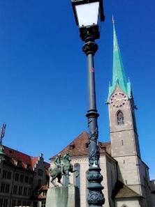 離開菩提園,彎曲的古雅巷道,走回利馬河畔,上了敏寺橋Münsterbrücke。遠遠的尖頂教堂,便是聖母主教座堂,它原為本篤會女修道院,它是古蘇黎士的地標。卡爾大帝接受羅馬加冕後不久,皇室的後代家眷,在這裡修道,因為修道院與皇家的關係,修道院享有特權。十一世紀神聖羅馬帝國皇帝亨利三世,授權女修道院鑄造錢幣,女修道院院長,集政治宗教於一身。一直到十六世紀,喀爾文新教革命,修道院被拆除,只剩聖母主教座堂。我們來到聖母教堂,走進時間隧道,來回中世紀與文藝復興。教堂內正作禮拜,我們只是一瞥,走回橋頭。這裡有座騎馬銅像,他是Hans Waldmann,十五世紀的蘇黎士市長,他是中世紀與文藝復興,過渡人物的象徵。