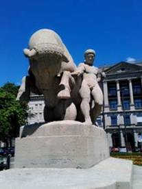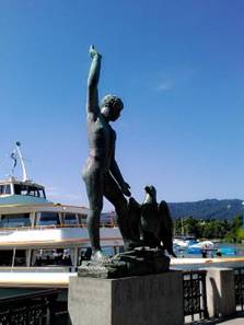 我們坐在蘇黎士湖畔,簡單的午餐。看著悠遠的蘇黎士山,平靜的蘇黎士河。湖邊一座Ganymed與老鷹的石雕,它是希臘神話的故事。Ganymed是特洛伊國王Tros的兒子,青春俊美。宙斯特別喜愛他,就自己變成一隻老鷹,把Ganymed夾持上了奧林浦山,代替春春女神,為眾神斟酒。這個古老的神話,被現代心理學,拿來討論戀童癖。湖風吹來,好是舒服,我黃粱一夢。大自然真是美麗,幻夢更是美好。歌德服了女巫靈丹,變成翩翩少年浮士德,開始瑪格麗特的愛情。Gibst mir die herrliche Natur zum Koenigreich,,Kraft,sie