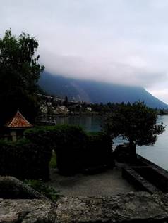 我們來到西庸古堡,萊芒湖一望無際,水波不興。古堡外邊,老樹扶蘇,青翠綠意。走進長亭,古堡中庭,中世紀樓閣。我們進入古堡廊道,羅馬拱形長廊。一個完整的生活圈,廚房、倉庫、客廳、教堂...。當然最吸引人的,便是拜倫,在圓柱上的刻字。在監獄裡,湖水城牆,雙重牢獄。煎熬鞭刑,像似墳墓。扶著鐵欄,湖水輕拍。引頸成一塊,不負少年頭。我在想François Bonivard,為了日內瓦獨立,忍受牢獄。Savoia為了侵佔日內瓦,非人性的壓迫。獨立自主與侵佔統一,在人類歷史,不斷的重復。演化如何終止這歷史矛盾?歐洲啟蒙,提出理念:包容與尊重。包容獨立自主的願望,尊重人性自由的要求。不知何時東方文化,從恐嚇與強壓,的迷思中,啟蒙過來。