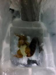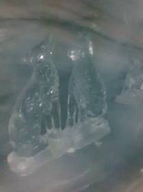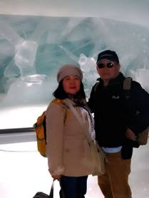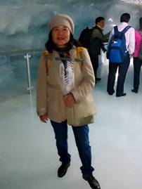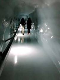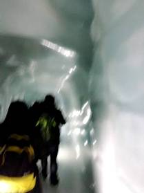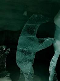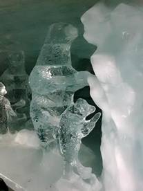 我們由處女峰時光隧道,轉入冰雕隧道。亮晶的世界,冰肌玉骨的感覺。我們滑著冰晶的隧道,壁上亮晶的冰雕。透明的熊寶寶,鑽石般的閃爍,還有五花八門的冰雕,甚是幻夢。我想起溫度,來自分子的運動,我們有了生命力。當分子不再運動,此時的溫度−273