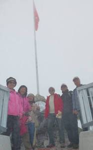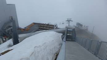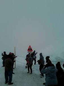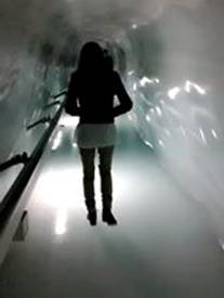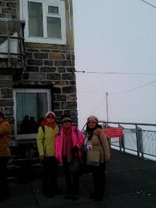 研究示意圖,知道探險方向,我們坐了電梯,又離開升降機,沿著暖和的甬道,推開冰海高原大門。一陣冷颼颼冰風吹來,斜坡的雪山高原,茫茫無際處女峰,我們必須抓住護衛欄杆,才能站得住腳。冰點吹在臉頰,血液擠出紅潤,冷寒的快感。我們往高處更攀一段,像似登山者的攀登,探險與征服。風雪實在太大了,我們便回到高原平台,進了暖和的車站建築。休息一下,喝杯熱水。我們再看平面地圖,下一站的探險,我們要去天空走廊Peak Walk。爬著樓梯,幾層樓的高度,真是氣喘如牛,後來才發現也可坐升降機上來的。走向處女峰的天空走廊,我想著牛郎織女星,喜鵲橋上的相會,在兩個山頭之間,萬丈深淵在鋼鐵橋下,積雪長廊的兩岸,遠方無際的飄雪。風雪越吹越大,但我一點也不害怕,忽然虔誠的感動,不可描素的暝暝之中,不可了解的彼岸,神與我同在。在天橋的一端,處女峰的地標,瑞士十字旗,在風雪中飄飄。我們親戚這裡合照,我們登上處女峰。
