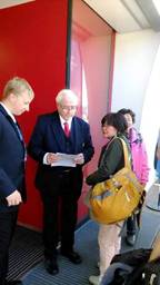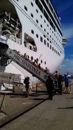今天我們開始北歐挪威峽灣之旅,早上從漢堡搭德鐵區間車,來到Rostock,轉地鐵來到外港Warenmünde,我們的義大利郵輪Sinfonia交響曲,就停在這裡。艷陽天的週末,海邊曬太陽游水的人群,加上郵輪遊客,像是嘉年華會的熱鬧。遠遠就看到Sinfonia英姿,我們親戚急著拍照,大家團體照。然後到郵輪大廈準備Check in,工作人員非常禮貌的,在行李上貼上號碼,就送到我們的船艙房間,不用舉手之勞。我們填寫一些表格,便領了IC卡, 8天7夜的生活將靠著它。登了Sinfonia塔橋,相似登飛機的安檢。Sinfonia12層樓,每層都有一個音樂家取名,我們九層叫柴可夫斯基。進入我們的9257船艙房間,窗子外邊便是Warnow河波羅的海入口,舒服的陽光照在白色床單。