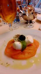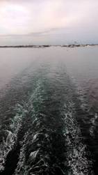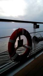 5點半晚餐,義大利晚餐:前菜、湯食、Pasta、主食、沙拉、甜點,豐富的晚餐,義大利人真的,吃飯皇帝大。後來知道無論中午餐、晚餐都是6個Gänge。也備有中文菜譜,我們的親戚就方便多了。我們點了生啤酒,為快樂出帆,愉快之旅乾杯。就在我們吃過晚餐的時候,郵輪慢慢開動了,我們上了甲板,看著大船出帆。船笛響了,大船轉頭Warnow河,慢慢進入波羅的海,白色的波濤緩緩而去,交響曲響起。我似乎聽到陳芬蘭,輕鬆巧快的節奏,快樂的出帆: