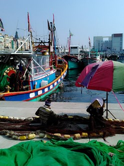 在德國就約好,宇平要來蚵仔寮。今天大選後,他來慶功會,他是我們協會的會長。好陽光的海風,穿著短褲,宇平說好舒服。我帶他到漁港逛逛,就是漁港風情畫,入港漁船,補網漁工,還有琳瑯滿目的魚貨,他一定動心。他家住安平,我跟他說,要帶父親來玩。妻與麗珊正買海鮮,我們來海角一號,請阿義代煮。我跟原著民老闆已經很熟,去年他幫我殺個,無料的樹上椰子。現流的海鮮上桌了,先來金牌台灣啤酒,海風吹來,平凡確幸的滿足。隔壁桌阿姨,微醺的蕃顛,唱著卡拉OK。蚵仔寮虱目魚丸、牡蠣菜瓜,我的最愛,還有...。娜娜寶貝,好樂好乖,阿姨抱抱,一點不陌生。阿炳來Line,說如有歌局,他要來參一腳。飯後妻帶綠穎散步,順便帶些烏魚子,現浮魚丸,回台南給達官。阿炳要來卡拉OK,宇平晚上還有飯局,只好各來兩首。宇平一鳴驚人,他精通台、中、德、英、西班牙語,在南美長大,德國上大學,德國工作。他的台語歌,阿炳有點折服,送一本奕齊著作,打狗漫遊給宇平。回安平走台17,濱海公路,不要上高速路。正是黃昏故鄉,夕陽晚風,愉快蚵仔寮一日遊,謝謝宇平來我家鄉。