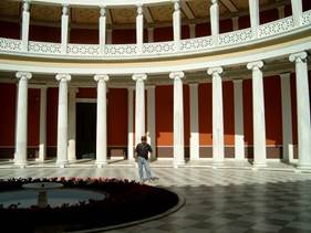 我們來到Zappeion留下的建築,他是奧林匹克運動的熱心者。Zappeion宮現在成了展覽館,還有紅色的巨筒廊道。Zappeion宮層層階梯,古典雅緻幻夢,好是風水。這裡散步真是舒服,地靈人傑的感覺。