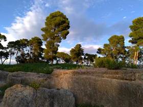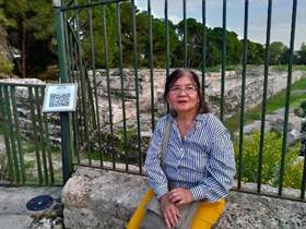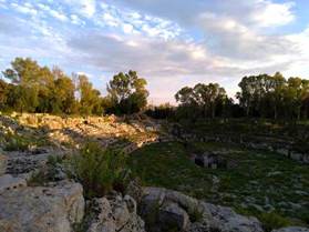 在這Paradiso路上兩旁,放有甚多無名的,空置石墎。意大利松搖曳,無限幽靜。我們來到羅馬劇場,它的建構時間比希腊劇場晚多了。規模也較小,如一般封閉的羅馬劇場,但它有唯一的特色,就是舞台的流水效果。在夕陽裡無限悠遠與美感。
