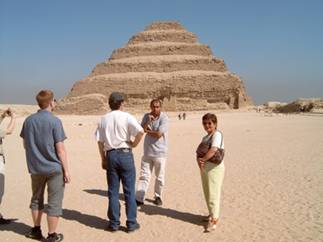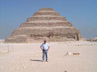 然後我們就去看六層階梯金字塔,它是佐塞Zoser(2630-2611BC)法老的金字塔,是埃及最古老的金字塔.進入六層階梯金字塔前,我們需要經過一座神廟,它的正面是一大片凸凹對稱的黃顏色城牆,有點像似軍事城堡.進入神廟裡面是柱廊,直通神廟底部.這座神廟可以想像,它是重要節慶時,祭祀或慶典的地方,木乃伊放進金字塔前,先在這裡作儀式.我們走出神廟的底處,六層階梯金字塔巍然座立在艷陽下,它的石頭黃紅黃紅的,看起來有點腐蝕.我們走上神廟城牆的陽台,我站在城牆上,沙漠吹來暖暖的熱風,前不見古人,難於相像古埃及人住在這裡,卻有無限說不出的讚歎與感概。據說法老金字塔的內部構造甚為複雜,不過我們不能進去參觀.遠遠的我們遙望著階梯金字塔,是甚麼天才創造了這樣偉大的構思建造,在太陽底下,它座立了4600年.我們走下陽台,在它的四週巡禮.良久良久,我不想再描述周圍的建築墳墓群,我寧願在它的四週徘徊,沉浸在崇敬的神秘裡,幽遠而懷古.