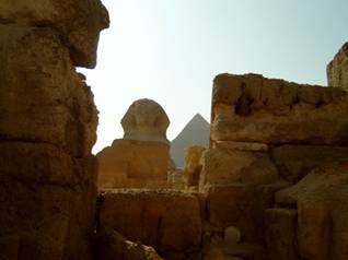 我們坐上巴士,轉了一圈.Gizhe的三個金字塔遠在後方,卻歷歷在眼前,它實在太大了.從卡夫拉金字塔延伸過來,人面獅身蹦然在你眼前.那麼莊嚴又幽遠,那麼真實又幻夢.我走上旁邊的神廟陽台,我要好好的端視她,這夢裡情人.當你真誠的看著它,它便會在你的夢中出現,然後完成你的願望.人面獅身曾經在Thutmosis(1412-1402BC)的夢中出現,它要Thutmosis為它掃去腳下的塵埃,然後幫他繼承王位,果然還願,Thutmosis在位十年.我在神廟的陽台上渡來渡去,我想著它的早晨,它的中午,它的黃昏.晨曦照著顏面四條腿,中午日正當中兩條腿,晚霞從金字塔昏黃掃過來,三條腿.這麼簡單的謎語,Ödipus就成了希臘底比斯的王.也因此,Ödipus娶了他的母親,無可逃避的悲劇!我在幻夢著,這到底是喜劇,還是悲劇.喜劇或悲劇的命運,都是無法逃脫的.你作就是了,迎接它或是承受它.