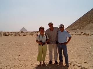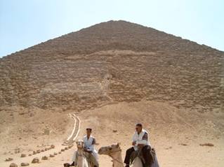 吃過中飯,下午我們去更遠的Dashur,這裡有金字塔群,彎曲金字塔、紅色金字塔、白色金字塔...我們的巴士沿著沙漠的公路而行,一望無際,遠遠的,一個一個的金字塔矗立,我們來到紅色金字塔前面,它是保存相當完好的金字塔.下了車,導遊作了簡單的介紹,就問我們要不要爬金字塔,意思要不要進入金字塔.我們這團現在只剩下三人,Jan 要爬,我本來有點遲疑,但看著金字塔腹部上面,站著很多東方少女,他們像似剛從金字塔裡面出來,輸人不輸陣,我便決定完成這盛舉,妻也跟進.我們往前走,好大的太陽,順著步道,然後開始往上爬,一塊大石頭接著一塊大石,爬到洞口,有點氣喘如牛了.但這才剛剛開始要進入金字塔,Jan帶手電筒,接著妻,我殿後.人根本不能站立,只能蹲著走,手伏在地上,洞窟有木條,就這樣一個蹲步一個蹲步的走.裡面不通風,空氣好怪,心理真有點緊張,冒險的感覺油然而生.往下走,至少走了100公尺,一半路,妻就放棄了,我想是否陪她回走,她卻獨自走.我趕上Jan.然後到了較空曠的大廳,還要往上爬,這裡沒有那麼窄了,我們繼續爬,又爬一二十分鐘吧.不能再往前了,我們才回頭,前後一個小時吧.當然汗流浹背了,回到洞口,好像作一件大事,站在金字塔洞口,環視沙漠,唯我獨尊,還真有點飄飄然.第二天大腿開始酸痛,連續了一個禮拜.
