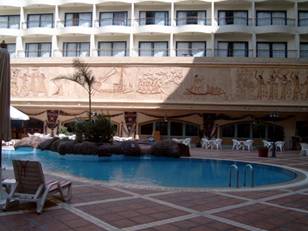 回到賓館還早,我就跑到院子裡的游泳池游泳,這個賓館還算高級,游泳池四邊都是躺椅,院子裡四周刻著仿古浮雕.太陽下山了,我們到賓館的四周走走,順便買晚餐,我們在開羅,旅行社是不供晚餐的.走進街道,是純粹埃及人的生活圈子,商店的人沒有一個會說外文的,要買東西只能比手畫腳,也煞是有趣.我們閒逛,總之無事,買了水果芒果烤雞可樂,然後回賓館,吃東西看電視.