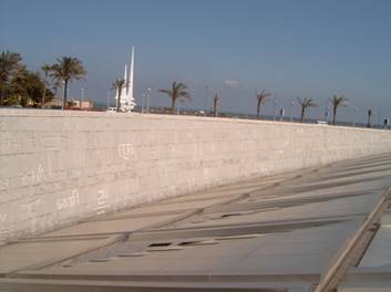Kom el-Schkafa 是羅馬時代的墳墓,我們來到Kom el-Schkafa,在入口繞著樓梯,要走三層才到最底層.在這裡可以看到亞力山大城的地下水.為了保護它的墳墓,要用人工抽水.這裡的地下墳墓,有複雜的浮雕,有埃及式的浮雕,如死亡之神Anubis、鱷魚之神Sobek.還有希臘式的浮雕,如酒神Dionysus與蛇女Medusa.Kom el-Schkafa是羅馬時代的墳墓,它的浮雕,融合了埃及與希臘的文明.我們在亞力山大城中心,看過了Katakomben von Kom el-Schkafa、亞力山大圖書館、龐佩之柱、克麗姬宮殿、法羅斯燈塔遺址.現在我們要去郊區的夢塔薩Montasah,我們晚上在那裡過夜.我們沿著地中海的海岸走,像是珍珠鍊,伊斯蘭的清真寺、商業區,伴著歐洲式的現代化大道.美麗的亞力山大港灣,陽光、海水、白雲,她使人想起法國南部的地中海蔚藍海岸.