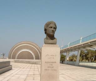 圖書館廣場立著亞力山大的頭像 |