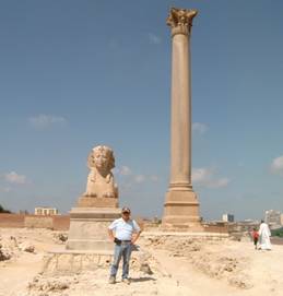 亞力山大在Rhakotis建城,托羅密王朝在這裡建立它的行政中心.帝國的中心在山坡上,它傲視著螯狀的地中海海灣,連接歐非,山水真好,風和日麗.我們經過繁忙的市區,遠遠就看到了有名的羅馬龐佩之柱.走上山坡,除了龐佩之柱,還有一大座人面獅身,孤獨的趴在在太陽底下,無限的不坎回首.這裡曾經有座Osiris的神廟,托羅密王朝又增建Osiris-Apis神廟,作為傳統多神的信仰.