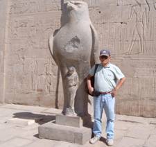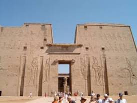 100公里,在尼羅河的西岸高地。今天9月18日我們要去參觀Horus神廟,來到一個大廣場,氣勢輝宏的神廟塔樓,展現在你的眼前。導遊跟我們解釋,這是托羅密王朝的神廟,即是埃及豔后Cleopatra的神廟,塔樓兩邊刻著對稱的浮雕,托羅密王朝的第十二世皇帝 Eros Dionysos(55-51BC)左手抓住敵人的頭髮,右手握著武器高高舉起,表示戰勝了敵人。這樣的浮雕內容,我們在5000年前的古埃及祭獻石雕板上便看過,托羅密藝術其來有自,馬其頓托羅密王朝,入境隨俗。站在Eros