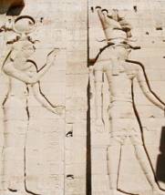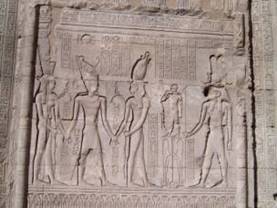 Dionysos 對Horus與Harthos的支持與祝福。他們都戴著上下埃及的王冠,Horus是鷹頭造型,Harthos是美神造型。浮雕Osiris對Horus的扶持,有埃及學專家解釋為,Osiris對Horus的扶持,意謂著托羅密王朝埃及艷后Cleopatra,對她與羅馬皇帝凱撒共同的兒子Caesarion的扶持。