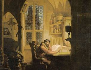 在中世紀高拱頂的書房內,浮士德不安地坐在靠椅里,感嘆著人生。浮士德對醫學法學哲學神學,無所不通,但什麼是人生契機,仍無所知。他幽愁的說:盈盈的月光,但願今宵你最後一次見我煩惱....。憂郁之靈,你來了,但願借你的柔光,走到山頂上..撥開一切知識的迷霧。