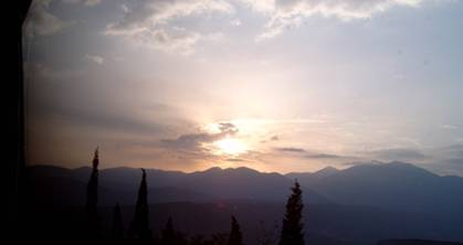 現在我們要慢慢離開伯羅奔尼撒半島,然後往北方的希臘大陸行走,下個目標是德費爾Delphi,這是我們這次旅行的高潮.必須經過Patra海灣,然後才能進入希臘大陸.我們經過新建不久的跨海大橋,看起來有點相似漢堡易北河上的跨橋,在對岸小城Rio稍微休息一下子,我們點了一些很有特色的希臘糕點,與不過濾的莫卡咖啡,坐在露天,看著大橋.我想著來希臘,到Delphi.應該帶點朝聖的心情,因爲Delphi是太陽神阿波羅的神諭聖地.在希臘神話裏,多少人千里跋涉來Delph,尋找阿波羅聖諭.我們是那麽簡單的就來到,尤其在大橋建好以後.我們循著Korinth海灣的Parnass山脈山路,盤旋迂回,遠遠Delphi古城就挂立在Parnass山脈上,俯視Korinth海灣,甚爲壯觀又秀麗.我帶著耳機聽音樂看風景,新天地、波斯市場、田園交響曲、聖母頌..巴士節節上升,夕陽慢慢從Parnass山脈隱去,海灣的黃昏氣象萬千.大地慢慢暗了下來,環山好像釋出天籟,今天是農曆八月十六,月亮從山的另一面慢慢明顯.我們已經到了高山,溫度慢慢涼了起來.終於到了Delphi的高山賓館,分過房間,洗過澡,吃過晚飯.月亮已經那麽圓的挂在山邊了,我站在陽臺,看著群山,遠方耀著稀有的燈光,我體會到什麽是山氣旦夕佳.茫茫的山氣在月光下,更加稀迷,更加神秘,山的寧靜,如此神秘.