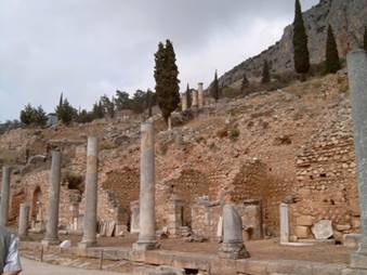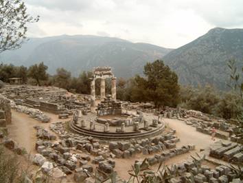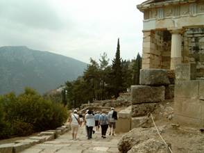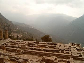 我們來到阿波羅神殿,神殿座立在神聖境界的中心,它的神殿已是廢墟,但六根多尼安圓柱還巍巍的,高聳在阿波羅祭台周圍.原來在神殿的前廳刻有希臘七智者的智慧語言,最有名的是:認識你自己gnóthi seautón.在小聖堂內有阿波羅的金身雕像,還刻有祭司的神諭. Delphi阿波羅神殿最早建於西元前第七世紀,後來在548BC被燒毀.重建,在373BC地震倒塌.現在留下來阿波羅神殿是346-320BC留下來的遺蹟.我們由東面看它,由北面看它,神殿氣勢萬千.我看過希臘最大的雅典雅典娜神殿(8:17),標準的的奧林匹克宙斯神廟(6:13),然而最神秘的卻是Delphi的阿波羅神殿(6:13).它建在Parnass高山上.山氣蘊氳徊繞,俯視大地,連接Korinth海灣,常年溫濕適中,得天地靈氣.我們找個視線佳好的頂點,休息一下,做個默想禪坐.自然的多神信仰是最早的人類活動,多神信仰後來被有格位的一神取代.一神還是多神,只是人類觀察立足點的差異,宗教信仰屬於人類自然科學能力,形而上學能力之外的天性,信仰針對不可認識的物自體,它以不同的形式在歷史上周流,永遠不會消失.我們也永遠不會說,那種信仰有更高的真理,宗教真理只是對不可證實世界的彩摸,我們信仰它存在,但它卻是不可科學證實的,因爲科學只是人類的部分有限能力.認識有限能力,便是認識自己的第一步.