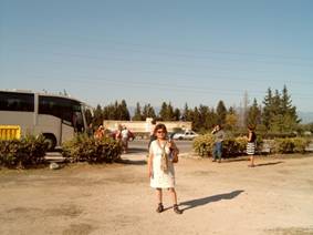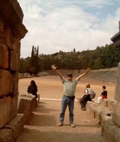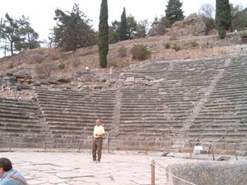 Sophia把我們帶到阿波羅神殿後方的露天劇場,它可容納5000人.我們看過Epidauros的露天劇場.Sophia也幫我們講過露天劇場的理論,所以她只是要告訴我們Delphi露天劇場的漂亮又壯觀.忽然有我們的團員,耐不住露天劇場的誘惑,又站在正中央,開始表演了,他表演了一出德國的政治諷刺劇,社會黨與基民黨,本來是代表工人與資本家的階級利益的.互相監督,是民主的常態.但現在兩黨大聯盟,爲所欲爲,人民向誰投訴?大家爲他鼓掌.最後Sophia跟我們說,我們還可以往上爬得更高,哪里有個可容納6500人的競技場,我們自由活動,一個小時後,在山下博物館處集合.我們當然是不會放棄機會的,後來雖然我們走得滿頭大汗,但還是不亦樂乎.我們在競技場的看臺上休息,競技場、露天劇場、神殿,三者是所有希臘古迹不可缺少的三寶.希臘競技場是人與人比賽,人文的表現.羅馬競技場是人與獸鬥,是處罰人的遊戲,有點野蠻.時間差不多了,我們慢慢走往山下,Parnass山脈的Delphi之旅,真令人喜悅.我們遊歷遠古時間,也神遊天上彼岸.