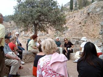 Delphi的阿波羅神廟坐落於峰頂高達2459米的帕納斯山脈的山坡上,在這個高度能夠俯瞰整個希臘中部.早上參觀過博物館後,Sophia把我們帶到聖地的入口處,我們坐了下來,她跟我們解釋Delphi的建山結構,由不整齊的石塊沒缺陷的銜接,而成山牆.沿著山牆便是Delphi的神聖之路.神聖之路兩次的來回通往阿波羅神殿的廣場.它兩旁立著各型碑文,聖之路分為兩段,第一段收集著朝聖者贈送的禮物,第二段收集的是寶藏,共有20個寶藏室.寶藏室由希臘神祗而命名,現在寶藏室只剩殘壁,碑文與壁上的美麗浮雕,都放在博物館內,宙斯、阿波羅、赫耳墨斯、阿雷斯戰神、雅典娜....在聖之路與阿波羅神廟之間,有高聳的愛奧尼亞圓柱、原有的Naxie人面獅身、阿波羅的馬車,馬車在373BC地震中倒塌,馬車夫後來被挖出來,現在高規格的保存在Delphi的博物館裡.但神聖之路上,最特別的,或說最神秘的,應該還是希臘人觀念中的世界中心,就是座立在世界中心上的一塊蜂窩狀石柱,她是世界的肚臍.希臘人認爲人體的中心是肚臍,世界的中心,便是世界的肚臍.那爲何說這石頭是世界的中心呢,宙斯放了放了兩隻烏鴉尋找世界的中心,一隻往東,一隻往西,結果兩隻烏鴉著這石頭上碰頭,所以這石頭是世界的中心,世界的肚臍.阿波羅在肚臍這裏建立神廟,然後發表神諭.希臘神話多少不能解決的命運與神秘,都在這塊蜂窩狀石頭上,尋求答案.人們遠從四面八方來到這裏,尋找未來.我在肚臍上頻頻徘徊,拳拳服膺..接著是雅典娜柱廊,雅典娜柱廊連接聖之路與阿波羅神殿,雅典娜柱廊是神聖之路上,保持最完整的建築.過了雅典娜柱廊由多層階梯組成,然後步步升高到達阿波羅神殿.