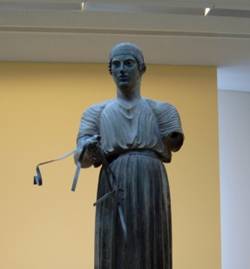 從帕納斯Parnass山脈的峭壁,傾斜到格林多Korinth海灣,這裡座立著德爾菲古城Delphi.Delphi在城邦制度下,不屬於任何城邦.但Delphi卻是古希臘城邦的共同聖地,是希臘泛神宗教,阿波羅信仰的中心.一直到西元392年,羅馬皇帝 Theodosius一世頒發了禁止異教信仰的諭令,阿波羅崇拜的信仰才告終結.今天我們首先參觀博物館,然後再實地參觀.博物館內好多浮雕,它們是從Delphi神聖之路的寶藏室取下來的,還有好多珍貴的文物,我們實地參觀的時候再來提起.
