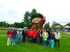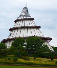 我們來到Elbauenpark園區,它是1999年,馬德堡聯邦花展的所在地(BUGA, Bundesgartenschau)。進了園區,涼快的菩提樹林,一望廣闊的精緻花園。滿園爭妍,尤其淡藍君子蘭花。悠閒的流水,我們散步在幽靜,道路與小徑。易北河的微風,自然的舒暢。德國有聯邦花展BUGA,還有國際花展IGA,每兩年一次。就是說每兩年,聯邦就有一個新的花園,留下一個公園。日耳曼民族性勤儉,理性沉穩,長遠的眼光,精打細算,最佳值的設計。我女兒是德國建築師,她跟說過這個哲學概念。我們在一座花荓造型前留影,然後便進入千禧塔參觀,這應是我們今天下午郊遊的主軸。