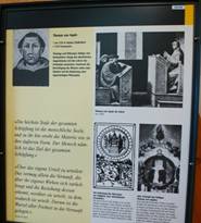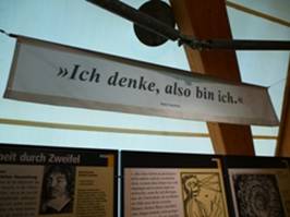 我們走進第三層樓,我看到聖多瑪斯的介紹,好震動!他是希臘哲學後,中世紀唯一的佼佼者,他跟隨亞里斯多德理論,寫了神學大綱與五路證明,他榮耀500年的中世紀。1517馬丁路德革命,一掃黑暗時代,開始了德國的文藝復興,這裡也介紹路德的思想,我覺得他的重要性,是他的革命性。我們曾對他甚多的描寫,不想這裡贅述。Cogito ,ergo sum,這是笛卡爾1614年沉思錄的拉丁名句,它開始了理性主義,笛卡爾被稱現代哲學之父。我覺得這句話,開始了歐洲的啟蒙運動。一直到1790康德的判斷力批判,結束歐洲的啟蒙。1784康德寫了什麼是啟蒙,當然啟蒙在人類的文明,演化永遠前進,啟蒙不會停止。Ich denke,also bin Ich。在千禧塔,第一次看到,我思故我在的德文翻譯,我好高興。就秀給榮杰兄看,我們常說的口頭禪。