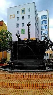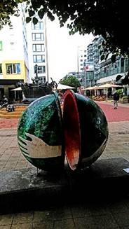 我們順著Breite大道走去,它跟易北河平行,中間就是多彩的百水建築群,與現在化的白色商場。另一邊道路,放立著許多半圓彩色藝術品,它觀念應該來自Otto von Güricke的真空實驗,馬匹拉著兩個真空銅半圓,科學與藝術的交融,確實創意。在一個小巷裡,有座女人沐浴的噴泉,姿態萬千,栩栩如生,就在咖啡館傍邊,甚是好看,它是馬德堡藝術家Heinrich