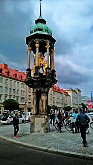 Apel的作品。我們在歷史博物館前照照像,薰衣草陪著廢墟造型,典型的庭院設計。我們輕鬆的漫步,總之打發一個半小時。慢慢我們來到一個大廣場,這時我們才知道,原來它是馬德堡的老市政廳。金色的馬德堡騎士,有點金碧輝煌。你可以想像他是奧圖大帝,也可以想像他是西元800年的查理曼大帝。他們都是法蘭克人的英雄,周圍跟著幾位婦女。整個雕像,被一座樓台高舉,我們在周圍底下端詳。還有德國導遊帶著觀光客,詳細的解說。它同樣是馬德堡藝術家Heinrich