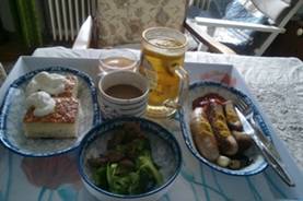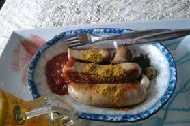 我的朋友在德國唸完書,回台灣作事,再來德國玩。他跟我說,最懷念的是德國小麵包,還有德國的咖哩香腸。今日去美麗的眼,回來後午餐,我就有咖哩香腸,烤過香腸,再加咖哩、沾點吉普賽番茄醬,特別的風味.聽說德國咖哩香腸,在美國也稍有名氣。今日午餐,還有蜂窩蛋糕與咖啡,這是我的最愛蛋糕。吃著午餐,聽著音樂,我準備50首台語歌曲,10首中文歌曲,2首德文歌曲。準備夏天回台灣的時候,仙公祖廟埕前卡拉OK,大車拼。當然我會去逛旁邊的漁市場,買虱目魚丸,然後走到沙灘,看柴山的夕陽,這裡有我太多童年的回憶。