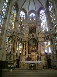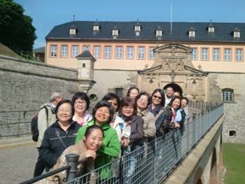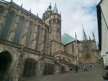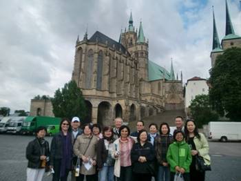 今天上午我們先作Erfurt的文化之旅,下午才開德國台灣協會年會。第一站Erfurt的主教座堂,好氣派的Domplatz,經過傳統市場的市集。巍巍的座堂居高臨下,寬廣的壯麗古典階梯,有點叫人翱翔其間的欲望。阿杜說,駐Darmstadt劇院,來自台灣的歌舞總監林美紅,曾在這氣派的階梯上,導演過歌舞劇Superstar,真是Sensation!!阿杜哼著Superstar的主題曲,有點飄飄欲仙的感覺。我要求大夥上天梯前,先照個像,等下無法盡入鏡頭。我們慢慢走向階梯,進入主教座堂,有點飛向天堂的幻象。走進座堂,高聳而寬廣,這第八世紀的建築,真是富麗而堂皇。它是教皇GregorII (715–731) 欽點的宗座教堂。雖然經過薩克森的宗教革命,一千兩百年來,它還是企立不動,永遠高貴美麗。我們驚嘆的說:百足之蟲,不死也不僵。每次參觀教堂,都會碰到同樣的問題,基督教跟天主教的教堂如何看得出來?大概印象:天主教裝飾富麗,基督教簡單大方。準確些:祭台與聖體龕是天主教堂的中心,基督教堂有個高掛的牧師宣教台。一定的分別:天主教有告解台,教友需透過神父與神慚悔;基督教堂沒有告解台,因教友可直接跟神講話。我們走向祭台,兩邊是VIP坐位,表示天主教政教關係的密切,我們在簡單的坐位上,寧靜一會,我們不一定是基督徒,但它的寧靜氣氛,或許也可找到片刻的心靈:人活著只是恓恓遑遑的忙碌嗎?回頭是岸,立地解脫。2012-06-02