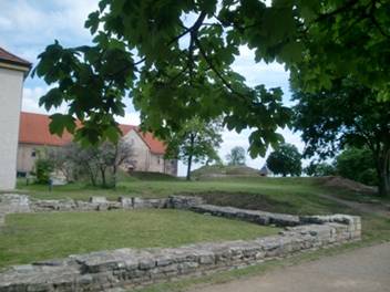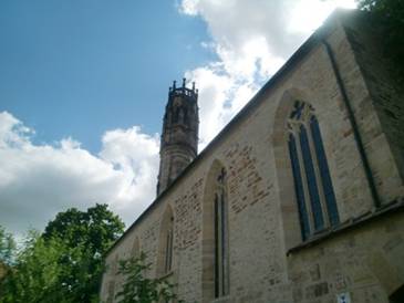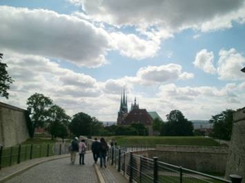 王博士跟我們說,我們要參觀的下一站是Citta della Petersberg彼得山城。我們來到山下,抬頭仰望,彼得山城的雲彩,朦朧而神秘。走向山城寬廣的棧道,石頭大門上刻著:Citta della Petersberg。進了甬道,廣闊平原一攬無餘,古戰砲在陽光下。這好像是山城唯一的景點,我們的小姐們,紛紛擺首弄姿,準備照相。山城四周圍牆,綿延無缺,盡是兵哨,往山下遠眺,Erfurt老城盡在眼底,山城軛著主教座堂,我在猜想:這應是古代的堡壘,也保護著主教座堂。但往前走,卻無軍營的痕跡,王兄說前頭便是修道院的遺跡廢墟,原來這裡是德意志羅馬帝國時代的宗教中心,本篤會的修道院是為中心,Petersberg是帝國的精神堡壘,很多德意志神聖羅馬帝國(692-1806)的重要慶典都在這裡舉行。我們走向圍牆看台,諾大的山城,我們對它的歷史仍然陌生。我回家查了Petersberg的資料,我覺得把它放在這裡還是有意義的,它跟德意志神聖羅馬帝國的政教之爭汲汲相關,當然我只能零散說些: