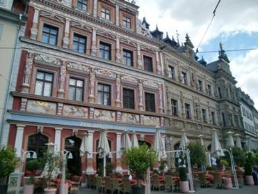 我們離開天上宗教與的政治紛擾,回到快樂人間。我們來到漁市場,古時是賣魚的市場,如今是商業區市政廳。到處露天咖啡廳,美麗的古典建築,紅底白色牆上圖案,把遊客這裡來吸睛。羅曼蒂克的街道,來往人潮,有點擁擠,各式袖珍的商店,蛋糕店、鐘表店、首飾店、禮品店……..,最誘惑人的還是意大利冰店。拿著餅乾愛斯,我舔一口,老婆一口,東張西望,隨意玩耍,青春作伴,老來牽手,真的快樂,無憂無慮。你還想當教皇嗎?你還想當德意志神聖羅馬帝國的皇帝嗎?2012-06-02