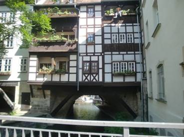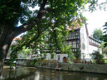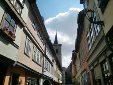 我們在街道閒逛,轉個灣便是柑仔店的橋Krämerbrücke,Gera河流流經這裡,穿過桁架樓房,小樓台被裝飾得小巧玲瓏,奇花異草,隨著微風,向遊客招展。流水與林蔭,忽然使人涼爽,景色真是宜人。沿著Gera河流,岸邊水邊,小餐廳咖啡廳,鱗次櫛比,有點桃花源的意境。如我在Erfurt多住幾天,我一定會來這裡吃個晚餐。這裡橋邊有個長凳,我們是有點累了,在這裡休息一下,幫太太按摩按摩,疏疏筋骨。阿公阿嬤都想這裡留個影,孫兒們看看我們都悠閒,又多快樂!2012-06-02