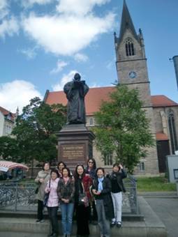 nicht sterben, sondern leben und des Herrn Werk verkünden.我不會死亡,而是永生,而且永傳福音。因為在這裡等車,我們有比較多的時間,瞻仰銅像,讀讀這詩歌,我們大夥照相留念。或許真能領悟什麼神秘,體會這詩歌。我不會死亡,而是永生。這是今天Erfurt旅遊的最後一個節目,圓滿而神秘的節目。Ich werde