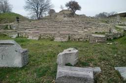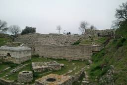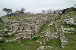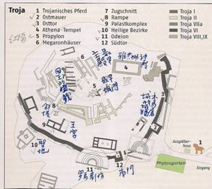 2013-03-07.我們隨著荷馬的足跡,經過三個多小時,由Temizel的沙灘飯店,來到特洛伊。在巴士上我們的導遊,讀著伊利亞德,特洛伊的木馬屠城記。這是我熟悉的希臘神話,以後我還會把這神話不厭其煩地再說一次,它是歐洲美感的泉源。我們來到特洛伊,很快便進入古城的遺跡。因為參觀的人很多,我們沒從頭參觀,而是從最後的羅馬時代開始看,倒著回來參觀。我想先把特洛伊古城,挖掘的歷史發現,簡單的先說大概,提綱挈領,然後接著再做解說: